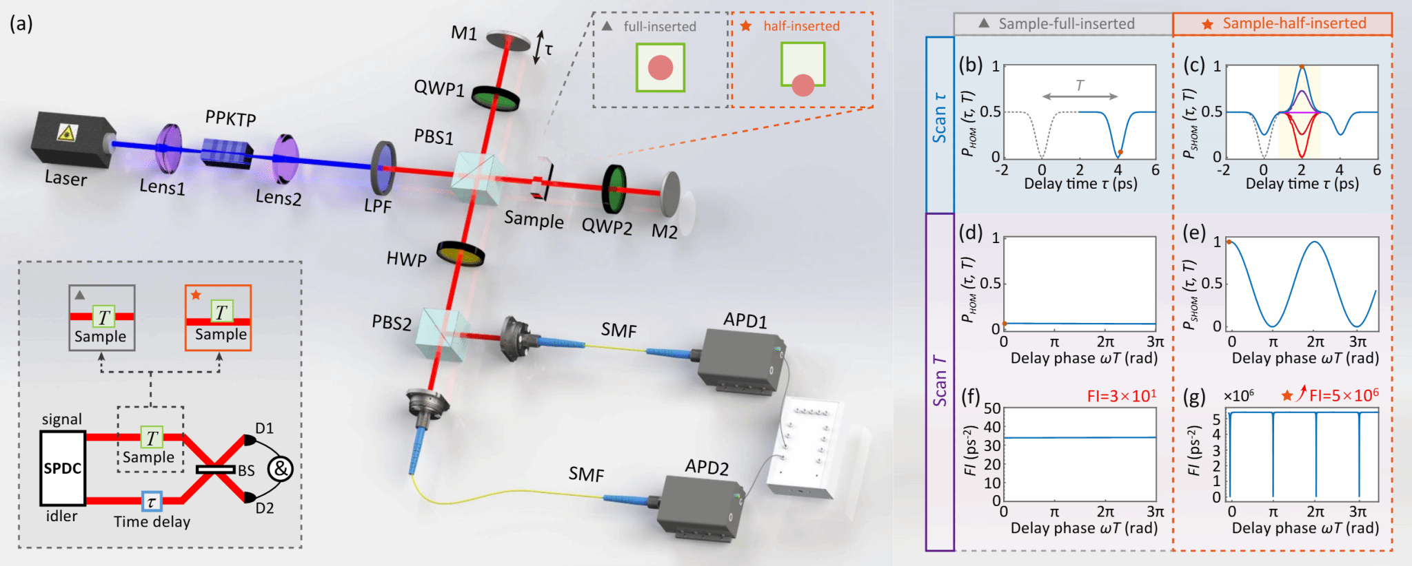 研究团队提出了一种样品半插入型HOMSHOM)干涉仪,即只让一半的光子通过样本,另外一半沿原路通过。这种巧妙地结构设计能够产生“凹陷-凸起-凹陷”型的干涉条纹,可将Fisher信息提高五个数量级,从而显著减少测量次数,快速实现高精度测量。研究团队在实验上使用了O(107)个光子,达到的平均精度为4.09 纳米(13.63 阿秒),平均准确度为1.22 纳米(4.07阿秒)。与之前报道的HOM方案相比,光子数减少了四个数量级,重复试验次数减少了约175倍。