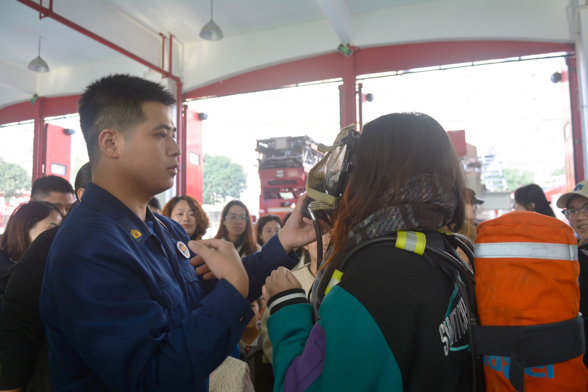梅溪湖消防救援站讲解员为成员们普及了有关消防安全的知识。他介绍了不同消防车的功能和车内设备,讲解了每种装备的用途和操作方法,教导成员们如何区分两种消防服应用的场景,如何预防火灾以及面对火情时的处理方法。
