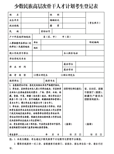 5. 报考少数民族骨干计划的考生须上传:本地主管部门盖章认可的“少数民族高层次骨干人才计划考生登记表”。