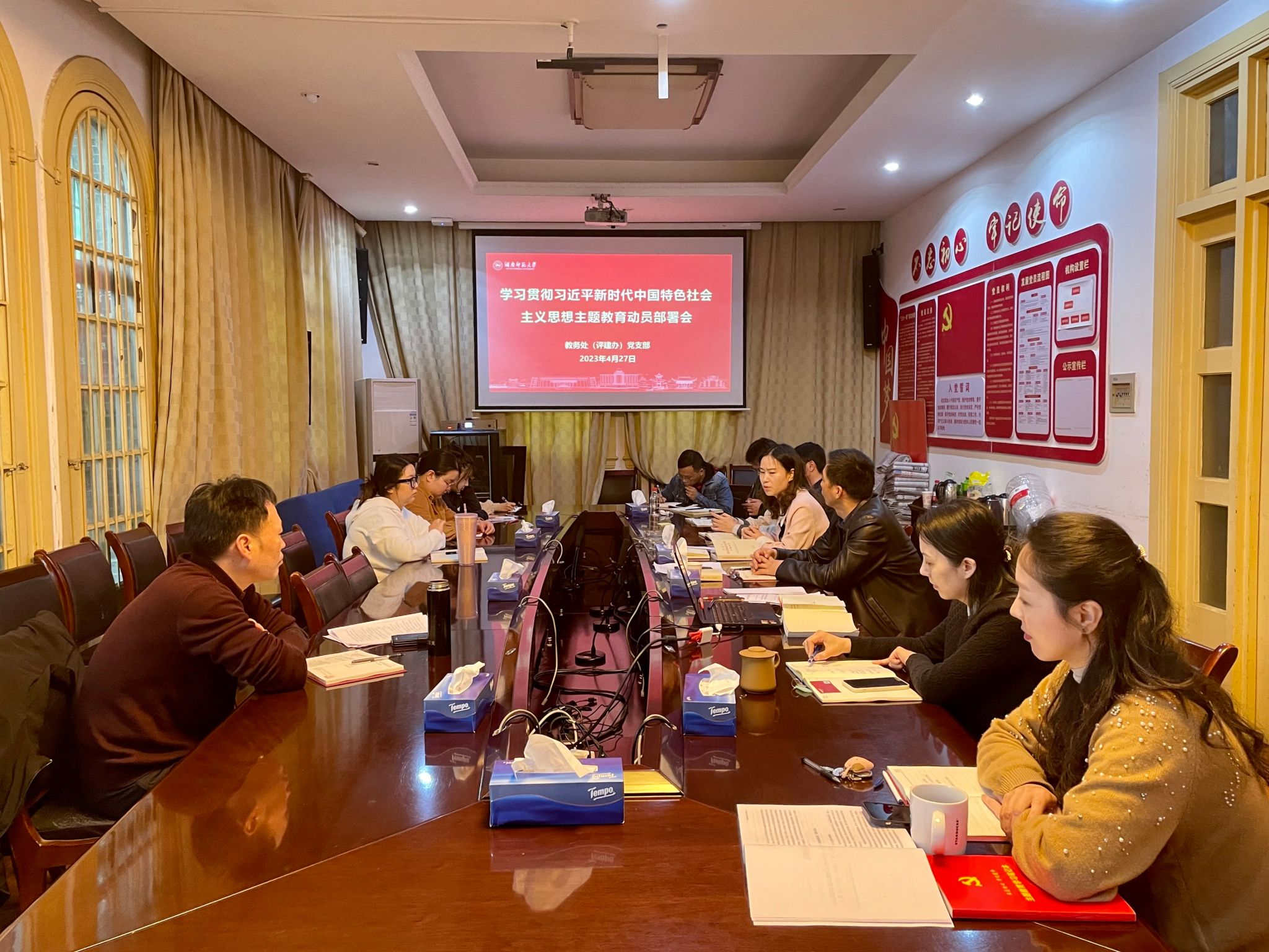 4月27日下午,教务处(评建办)党支部在教务处二楼会议室召开学习贯彻习近平新时代中国特色社会主义思想主题教育(以下简称“主题教育”)动员大会暨“以学铸魂践忠诚”专题研讨会。会议由党支部书记罗明主持。