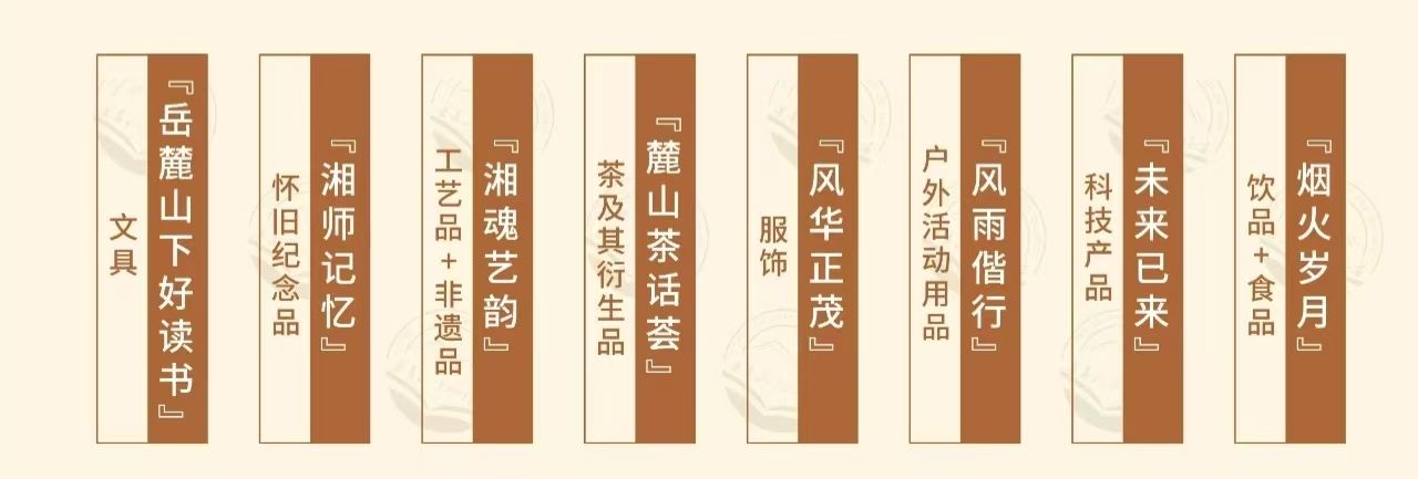 “湘师文创”根植湖南师范大学深厚办学底蕴,致力于文化创意与传播,研发、设计和展售文创品,搭建师生创新创业平台。主要文创系列品类包括: