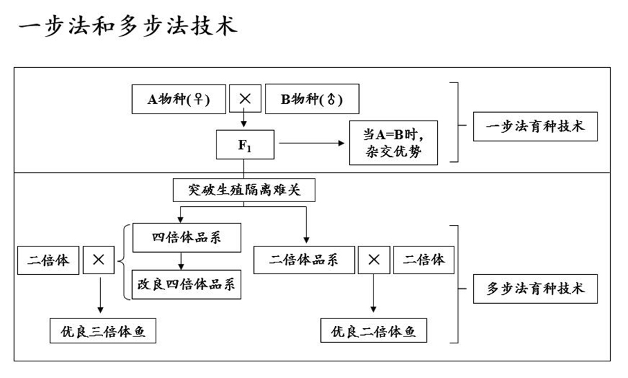多步法育种技术:突破生殖隔离难关,建立可育品系并用之制备优良鱼类的育种技术。